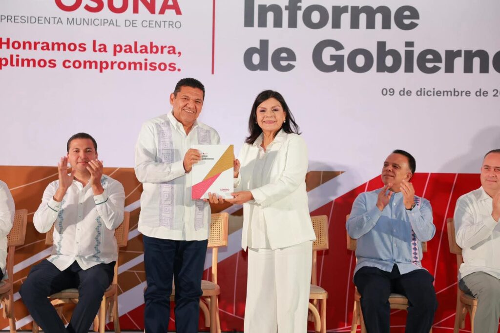En el Gran Salón Villahermosa del parque Tomás Garrido Canabal, y ante el gobernador Javier May Rodríguez y la presidenta de la Asociación de Autoridades Locales de México, Alma Denisse Sánchez Barragán, la edil entregó el documento al segundo regidor y síndico de Hacienda, Johnny Magaña Álvarez, en representación del Honorable Cabildo de Centro, así como al mandatario estatal.
