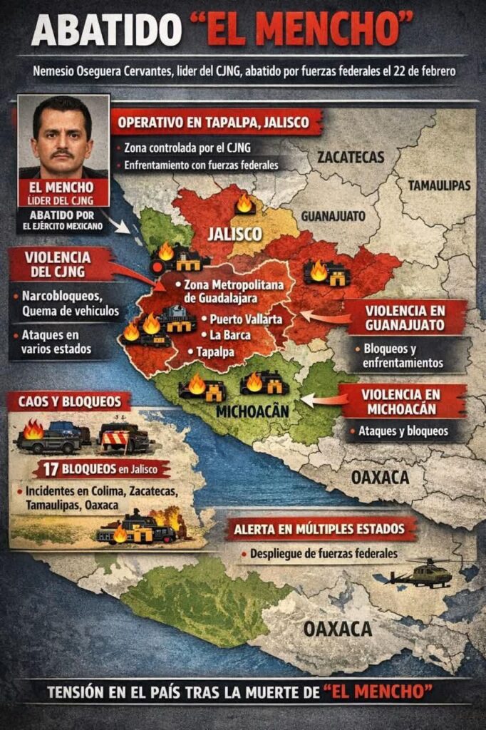Durante esta operación, personal militar fue atacado, por lo que en defensa de su integridad repelieron la agresión, resultando cuatro integrantes del grupo delictivo “CJNG” fallecidos en el lugar y tres heridos de gravedad, quienes perdieron la vida durante su traslado vía aérea a la Ciudad de México; entre estos últimos se encuentra Ruben “N” (a) Mencho, sin embargo, serán las autoridades correspondientes las que se encargarán de las actividades periciales para su identificación.
